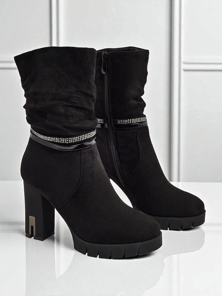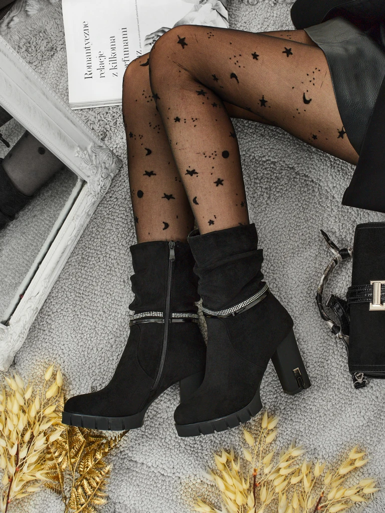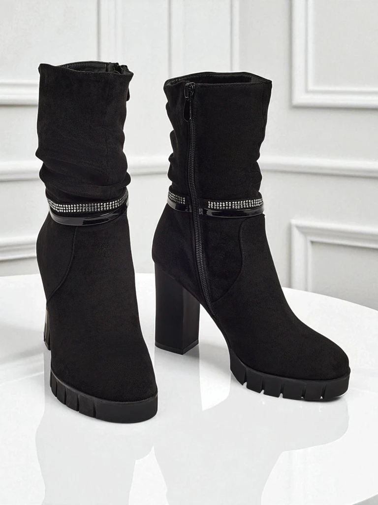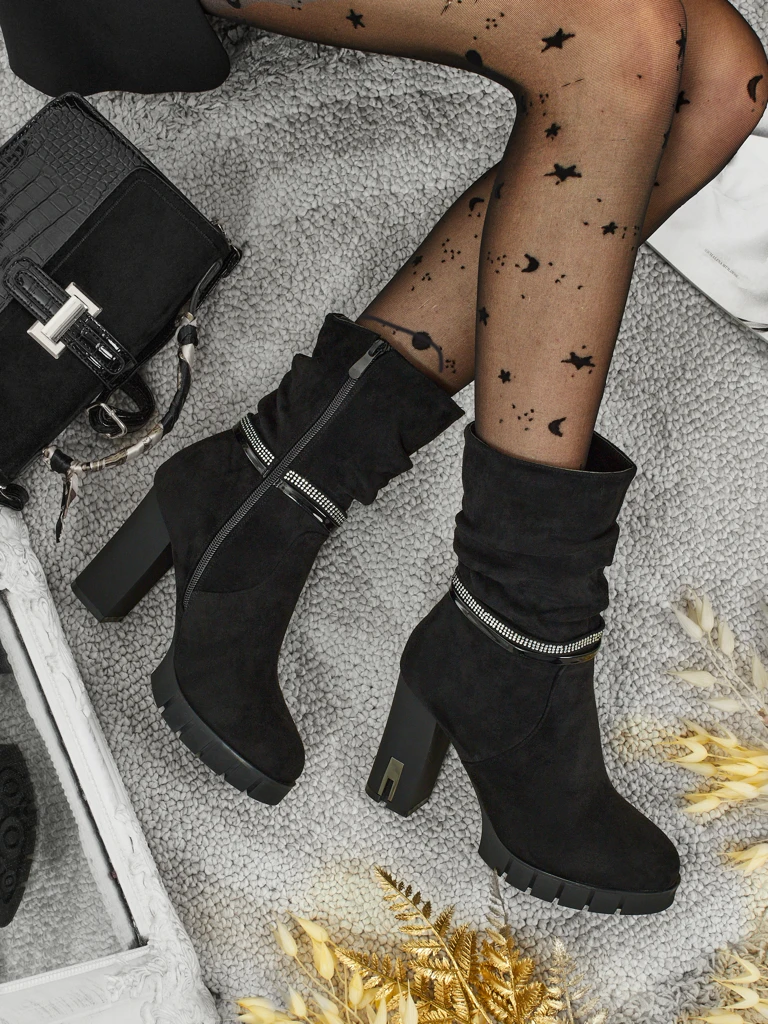 • Зручні ботильйони на підборах-стовпчику, виготовлені з еко замші. Модель застібається на блискавку. Має декоративний ремінець з цирконію.