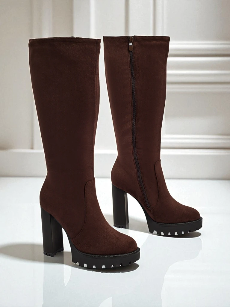 - Стильні жіночі чоботи до коліна на підборах-стовпчику. Халява виготовлена з еко замші, всередині утеплення у вигляді хутра. Модель застібається на блискавку. Ідеально підходять для повсякденних осінніх образів!
