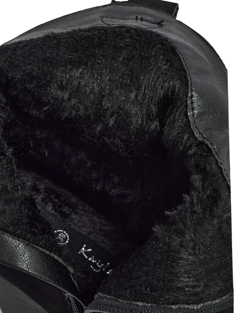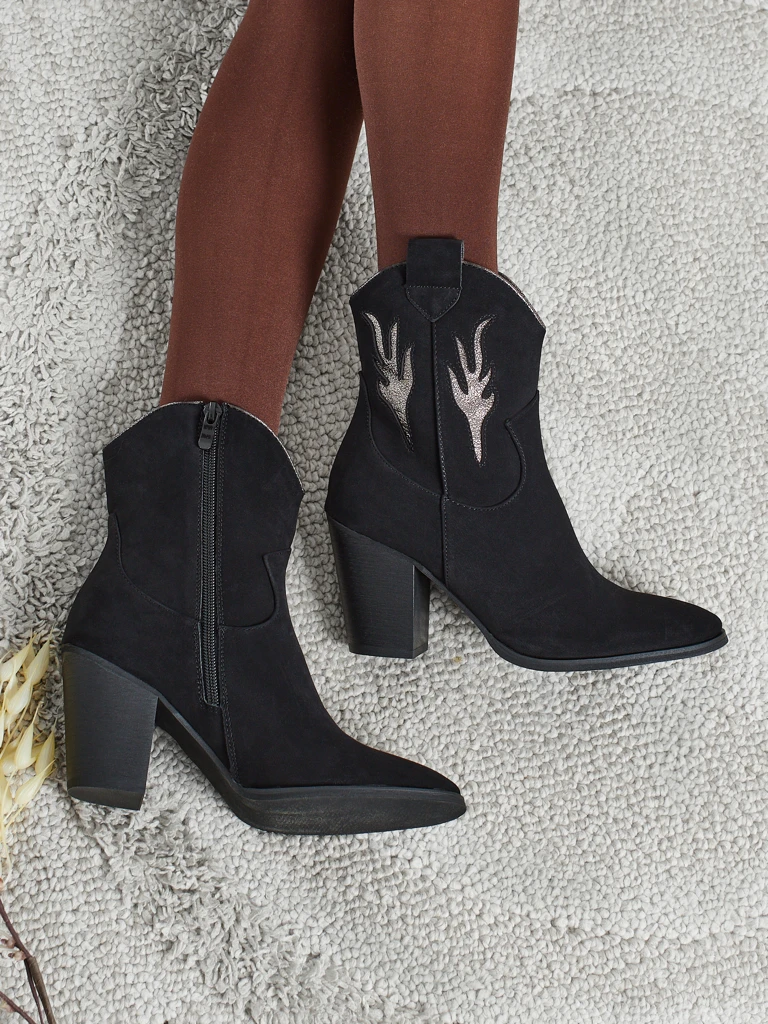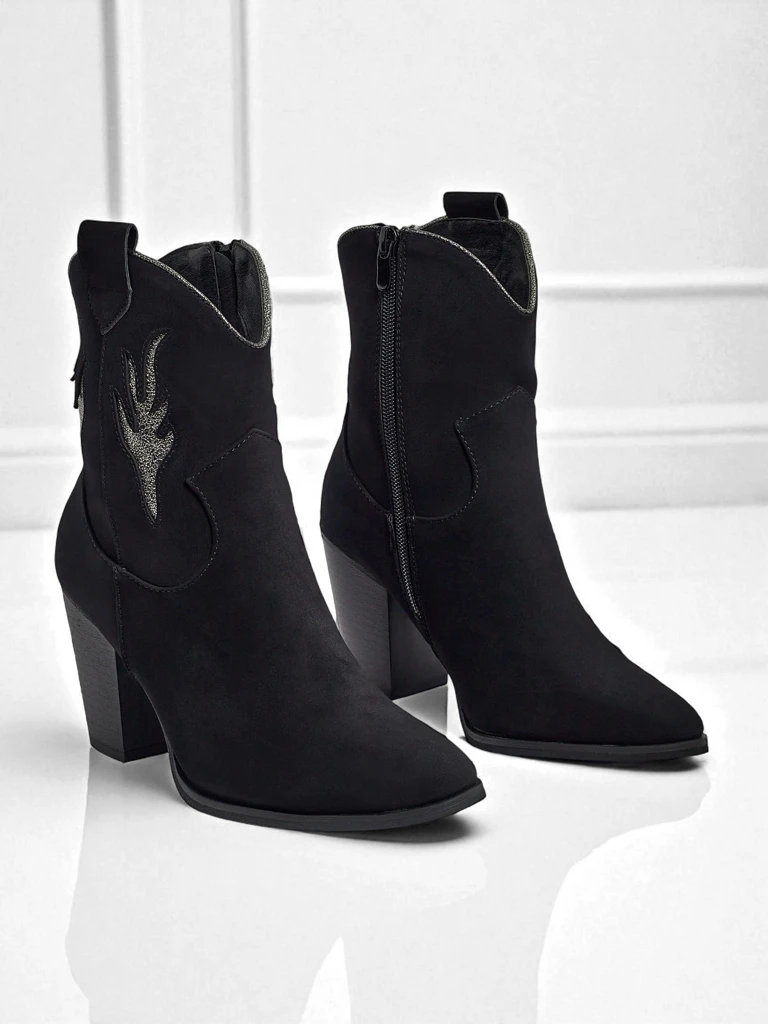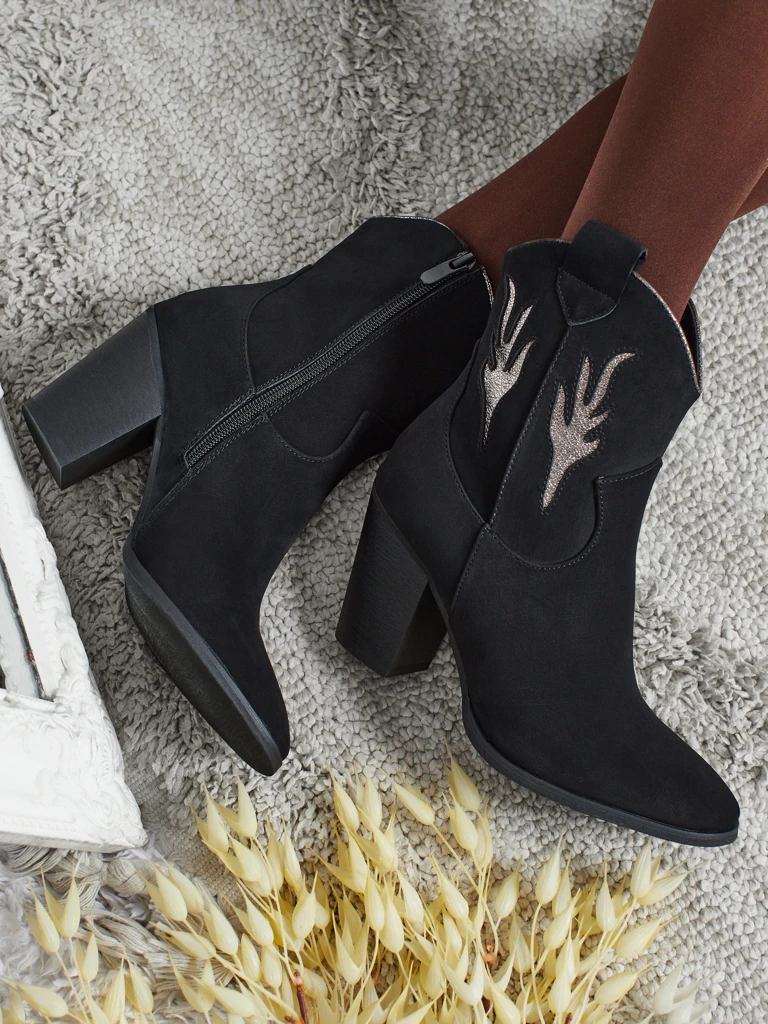 - Ботінки a'la ковбойки на підборах, виготовлені з екологічної матової шкіри. Утеплені хутром всередині, застібаються на блискавку з декоративними вставками з блискітками. Підходять до багатьох жіночих стилізацій!
