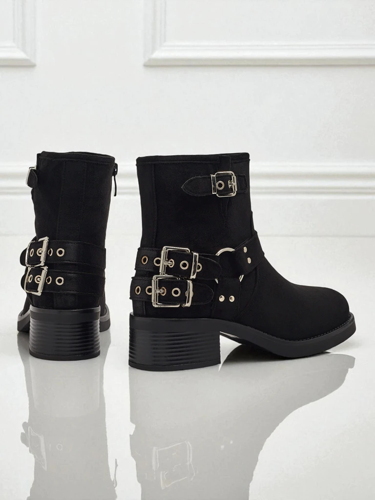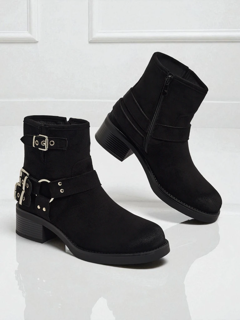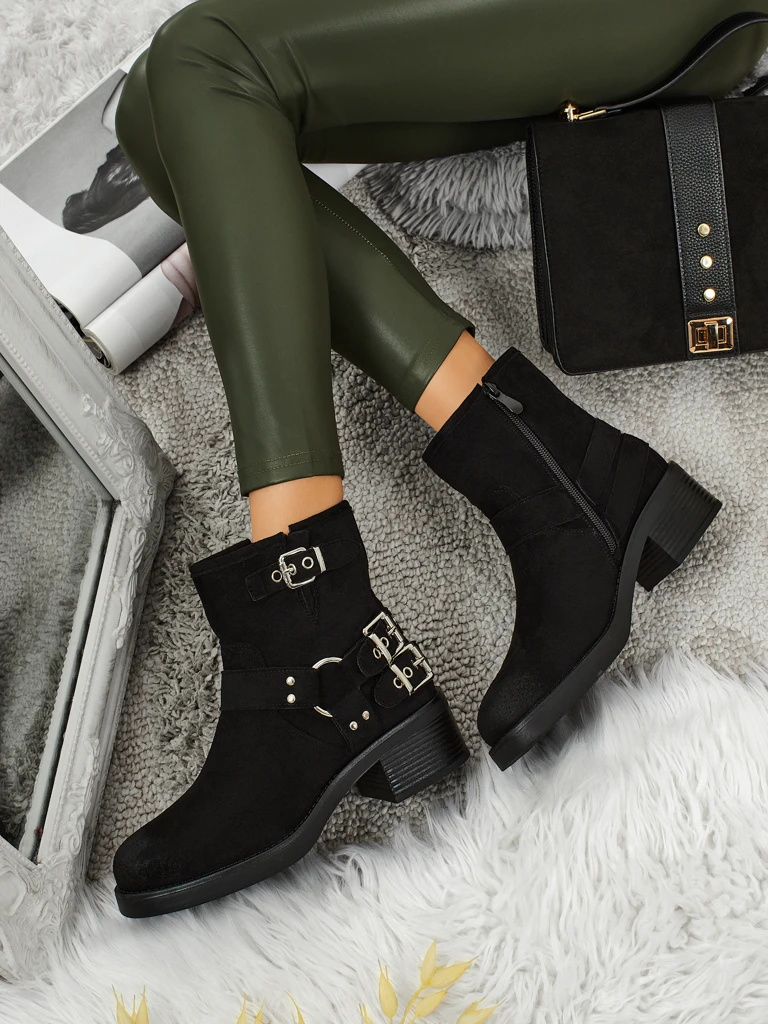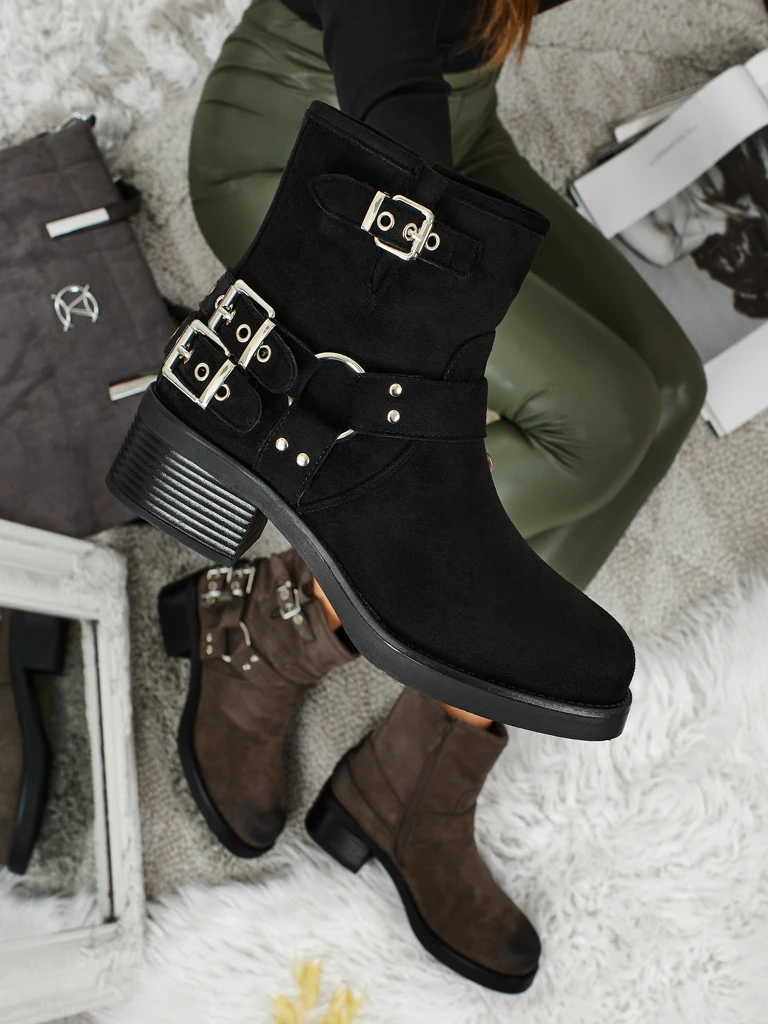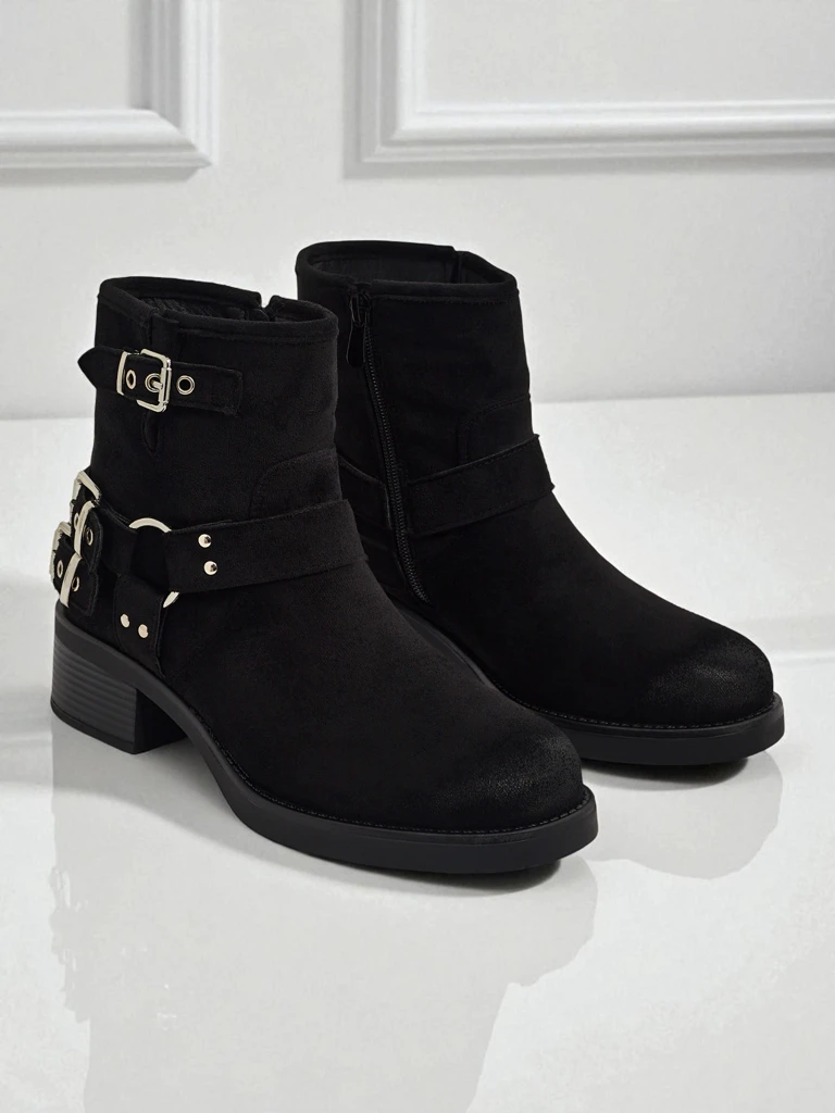 • Жіночі ботильйони з екозамші з пряжками. Утеплені ніжним хутром, взуття застібається на блискавку. Прикрашені пряжками. Підходять до багатьох жіночих стилізацій!