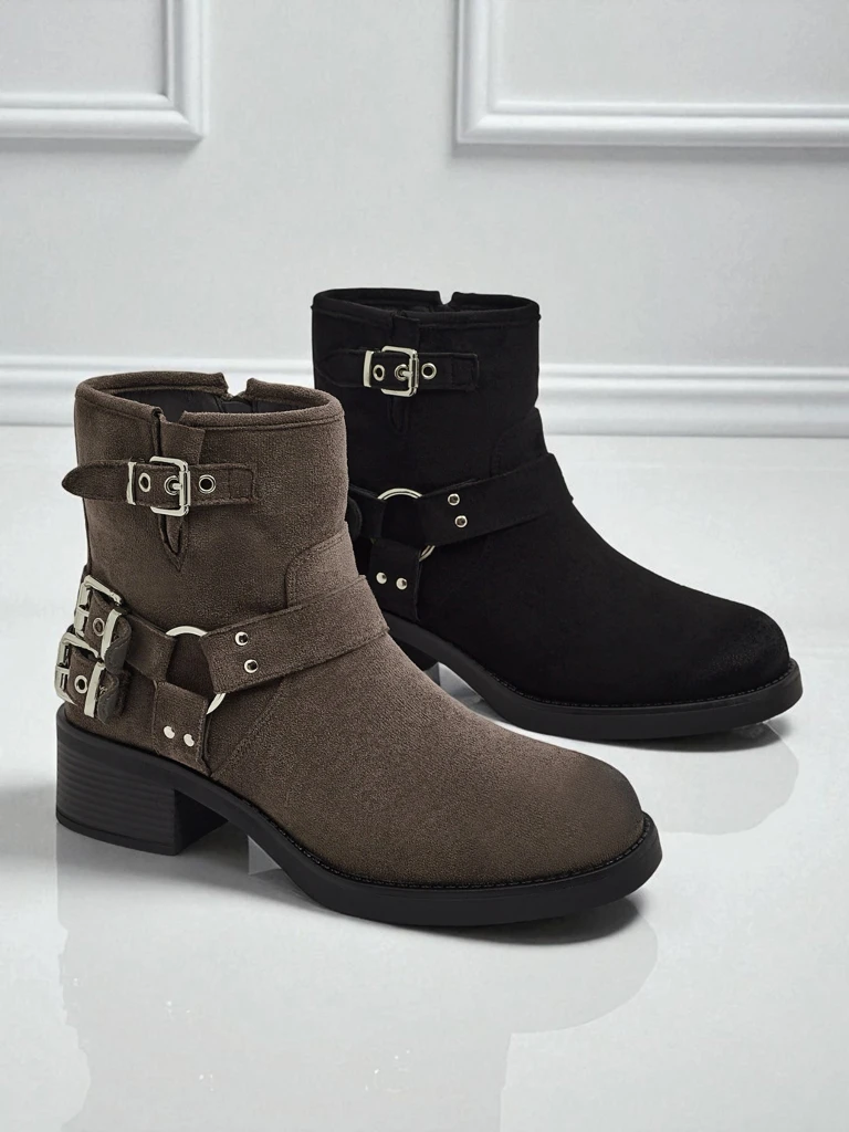 - Жіночі ботильйони з екозамші з пряжками. Утеплені ніжним хутром, взуття застібається на блискавку. Прикрашені пряжками. Підходять до багатьох жіночих стилізацій!