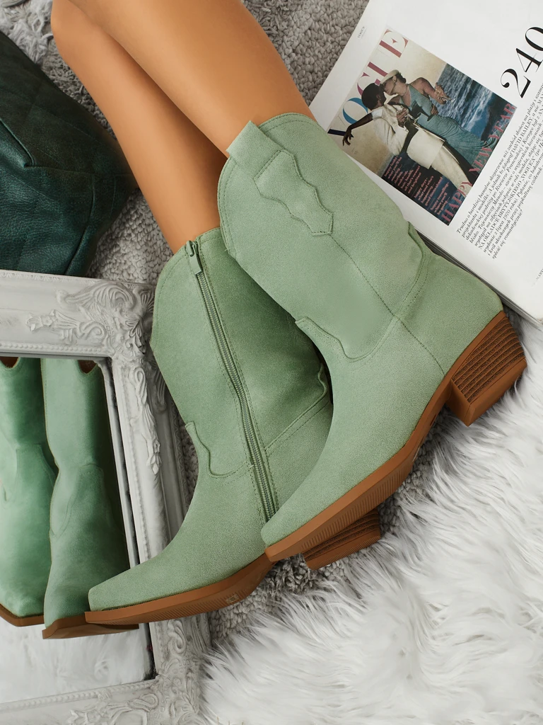 • Ботінки в стилі ковбойок на плоскій підошві, виготовлені з екологічної замшевої шкіри. Тканинна устілка, взуття застібається на блискавку. Підходять до багатьох жіночих стилізацій!