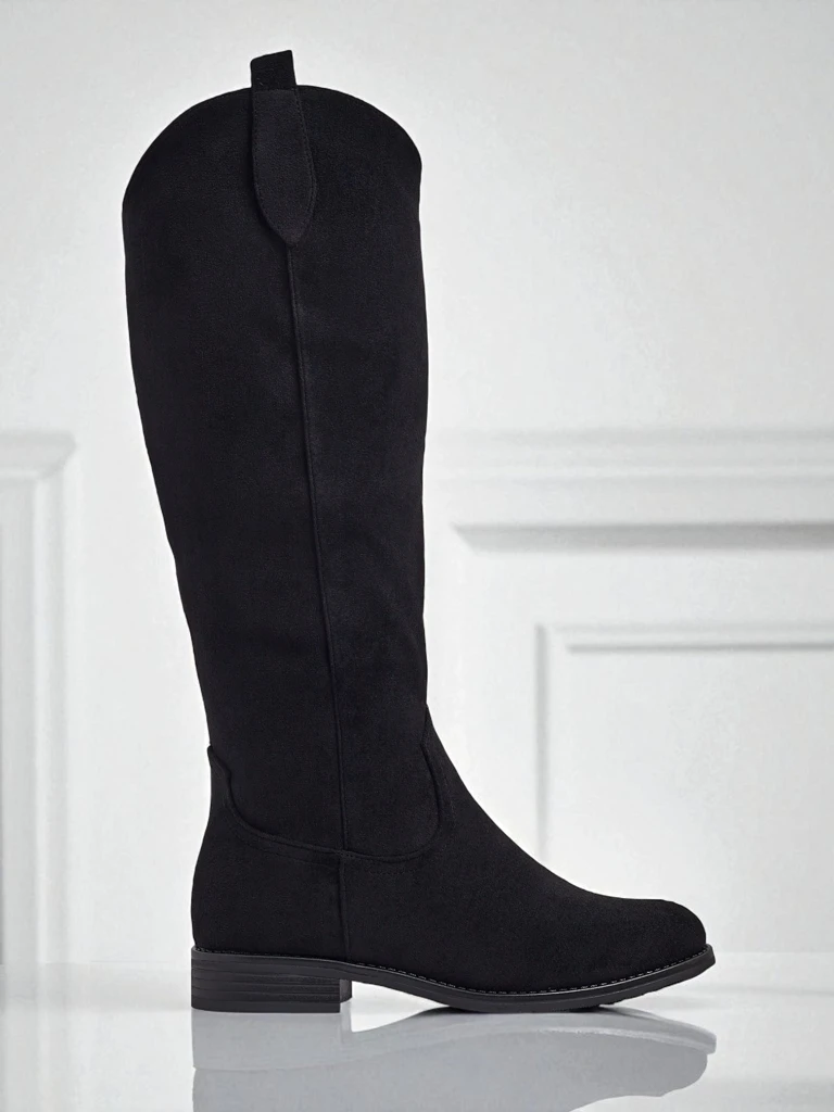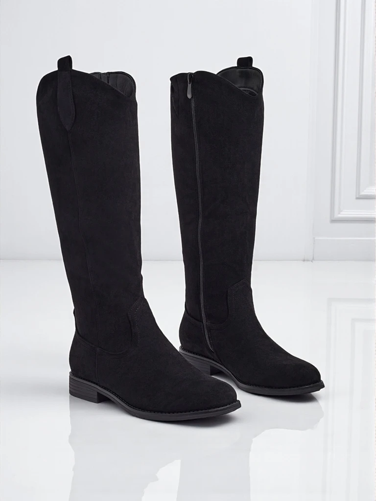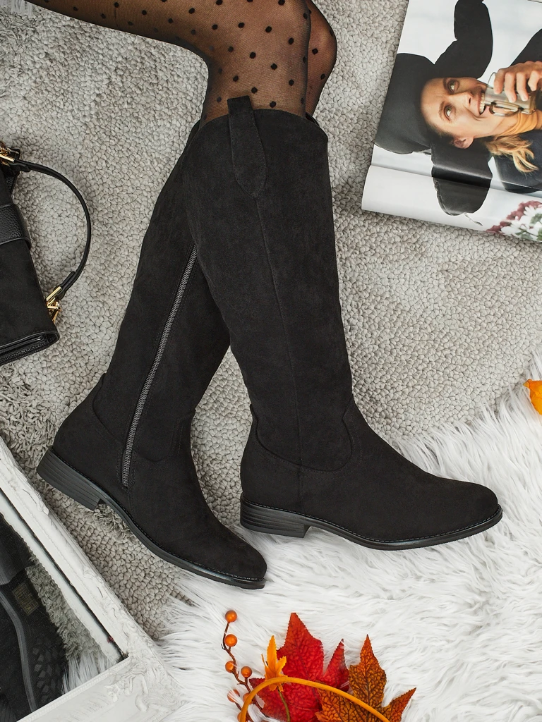 - Стильні жіночі чоботи до коліна на плоскій підошві. Халява виготовлена з еко замшевої шкіри, всередині утеплення у вигляді хутра. Модель застібається на блискавку. Ідеально підходять для повсякденних осінніх образів!