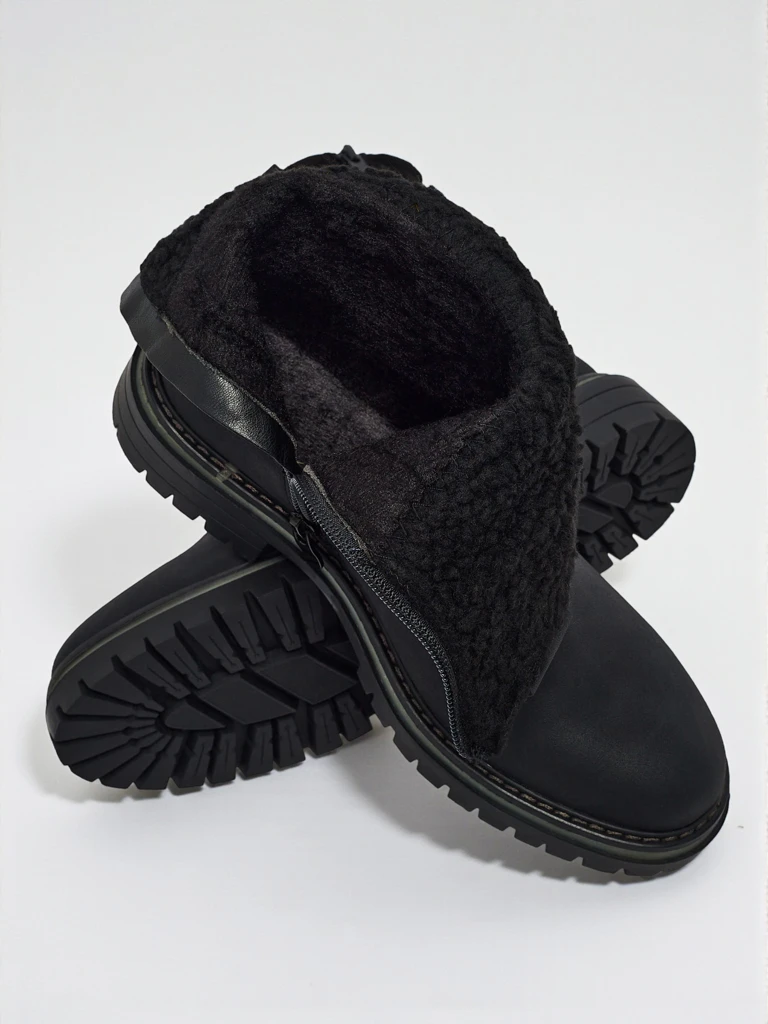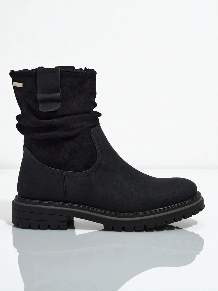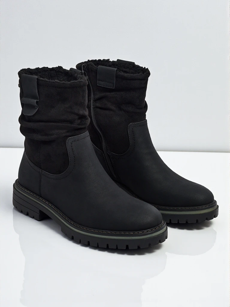 - Damskie botki zapinane na zamek. Model wykonany ze skóry ekologicznej zamszowej, na płaskiej podeszwie. Posiada ocieplenie a'la futerko. Zdobione lekko marszczoną cholewką. Wygodny i stylowy, idealny na jesień!