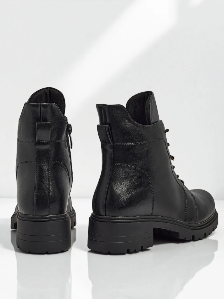 • Жіночі ботильйони з екошкіри, із застібкою-блискавкою та декоративною шнурівкою і круглим носком, додатково утеплені у вигляді хутра - сучасність, зручність та стиль в одному.