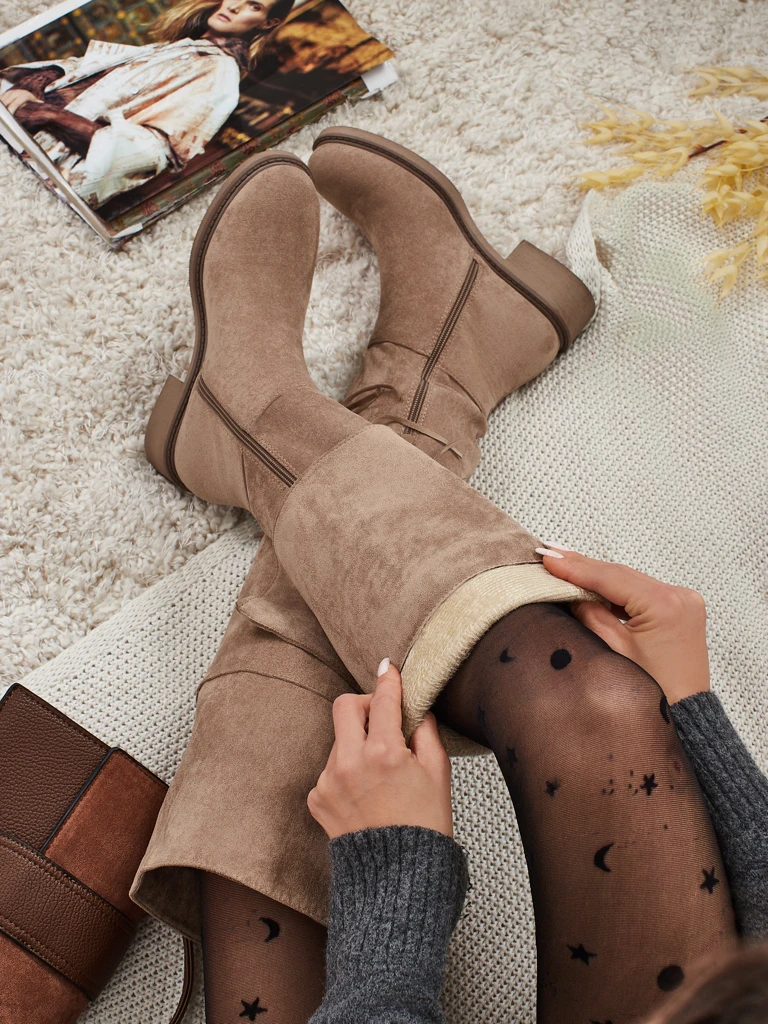 - Модні жіночі ботфорти на низькому каблуці. Верх виготовлений з еко-замші. Внутрішня частина вкрита ніжним хутром. Модель забезпечує комфорт і зручність у прохолодні дні. Модель застібається на блискавку до середини литки.