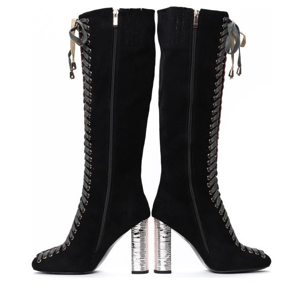 • Дивовижні довгі черевики, утеплені хутром. Верх жорсткіший - має довгу блискавку і декоративну палітурку. Декорований стовп на підборах. Високий палець ноги. Верх виготовлений із екологічної замші.