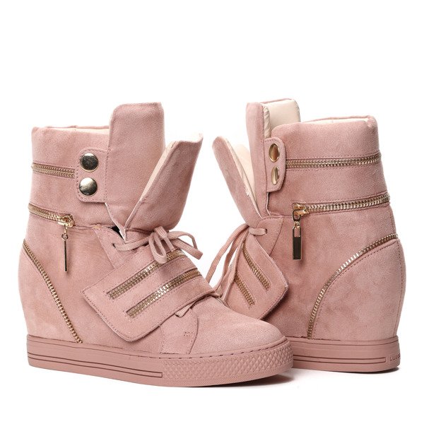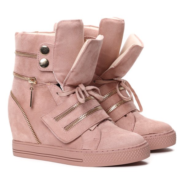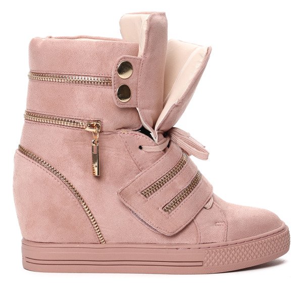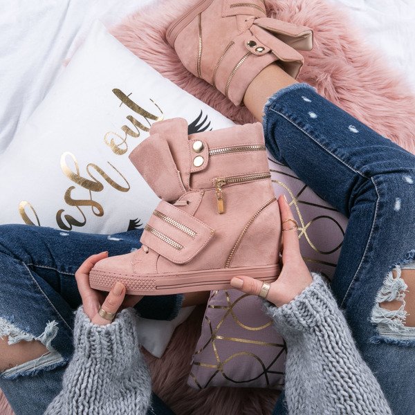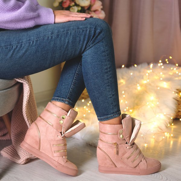 - Стильні кросівки на танкетці в рожевому кольорі. Виготовлений із екологічної замші та прикрашений золотистими блискавками. Взуття на шнурівці, застібка на липучках та гудзиках. Ідеально підходить для холодних днів!