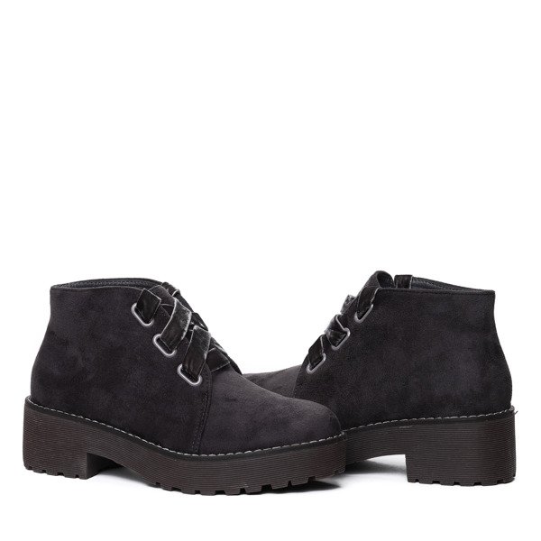 • Botki w najprostszym wydaniu, wykonane z miękkiego zamszu ekologicznego. Sznurówki z weluru. Wkładka pokryta ekologiczną skórą. Obuwie na 5 cm, płaskim obcasie. Solidnie wykonane i bardzo wygodne dzięki grubej podeszwie.