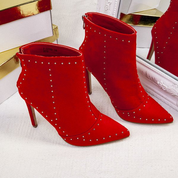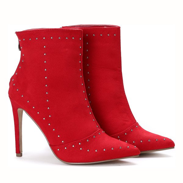 - Rewelacyjne botki na wysokiej szpilce wykonane z ekologicznej skóry zamszowej. Nosek typu szpic. Cholewka zdobiona dżetami. W środku ocieplenie w formie pianki pokrytej tkaniną. Świetnie się sprawdzą na co dzień jak i na wieczór.