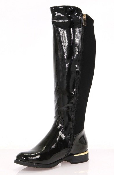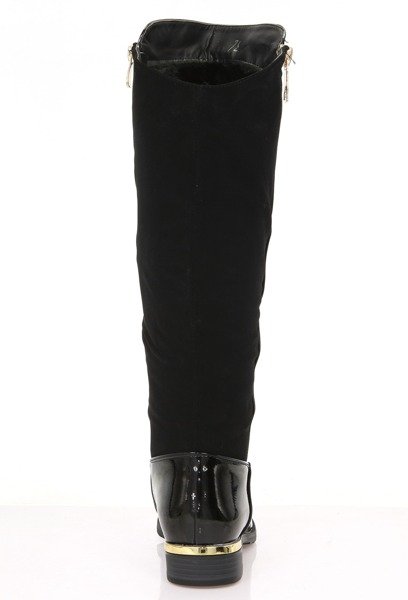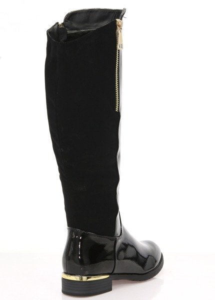 - Довгі черевики, натхненні класичними мушкетерами. Задня частина верху в матовій синтетичній замші. Декоративна золота блискавка та золота пластинка на підборах створюють елегантний дизайн. Утеплення всередині.
